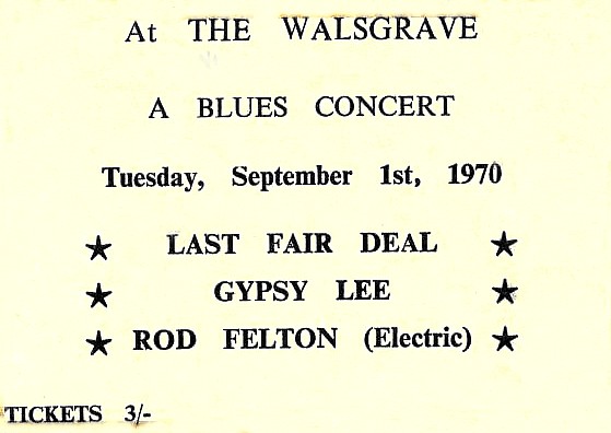 In the 70's and beyond, Rod forged a nationwide solo career. I was introduced to Rod Felton one night in 1970, while doing the door for Pete Waterman's Progressive music gigs at the Walsgrave in Coventry. Pete introduced Rod to me as "The only star that Coventry has produced". Pete was well aware of Rod's work and growing national reputation both with the grunt band and as a sol artist. In fact Pete put Rod on two months in a row, one with the Grunt band and with Rod doing a solo spot and one solo with 'Electric guitar', as seen here in the tickets.